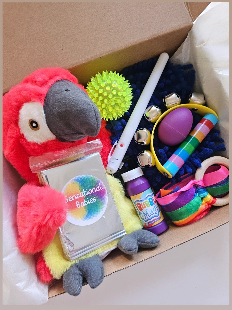 With an array of 16 different items to enjoy and explore which vary in texture,colour and sound, our best selling sensory box is sure to engage and entertain your baby whilst helping to aid their development